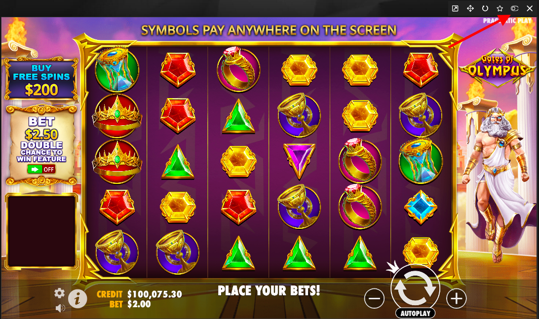 - Multipliers: During spins, multiplier symbols (“Gifts of Zeus”) can randomly appear on the reels. They can increase your winnings from x2 to x500. All active multipliers are summed up and applied to your total win once the entire sequence of matches in a single spin finishes.