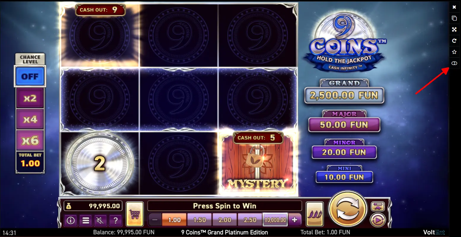 Демо режимі – ойын автоматын ешқандай қаржылық тәуекелсіз сынап көру мүмкіндігі. 9 Coins – Grand Platinum Edition автоматында демо режимі көпшілік ойыншыға қолжетімді, бұл сізге Cash Out пен Chance Level секілді ерекшеліктерді байқап көруге мүмкіндік береді, әрі олардың қаншалықты жиі түсетінін түсінесіз.