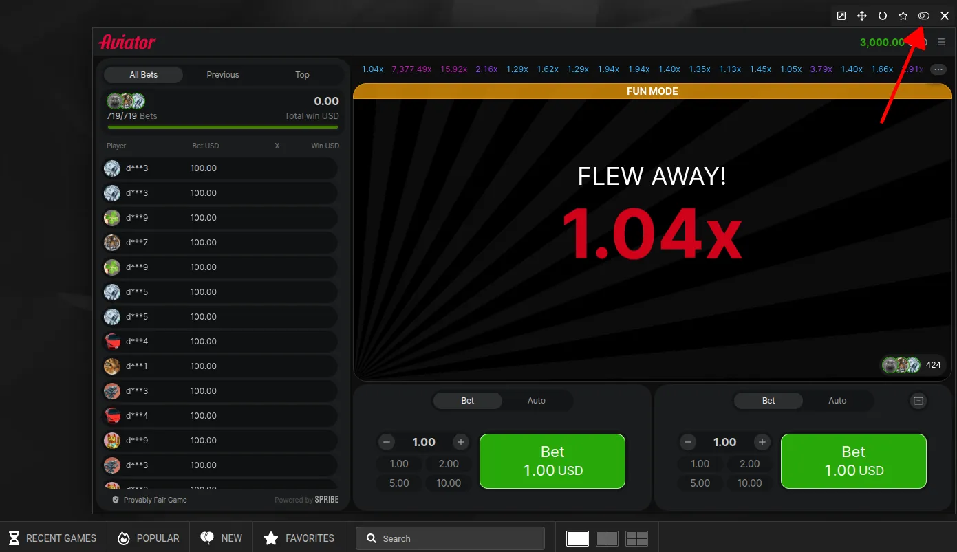 - Rejim açılmırsa, Spribe logosu yanındakı xüsusi keçidi klikləyin (tərtibatçının ekran görüntüsündə boz çərçivə ilə vurğulanıb).