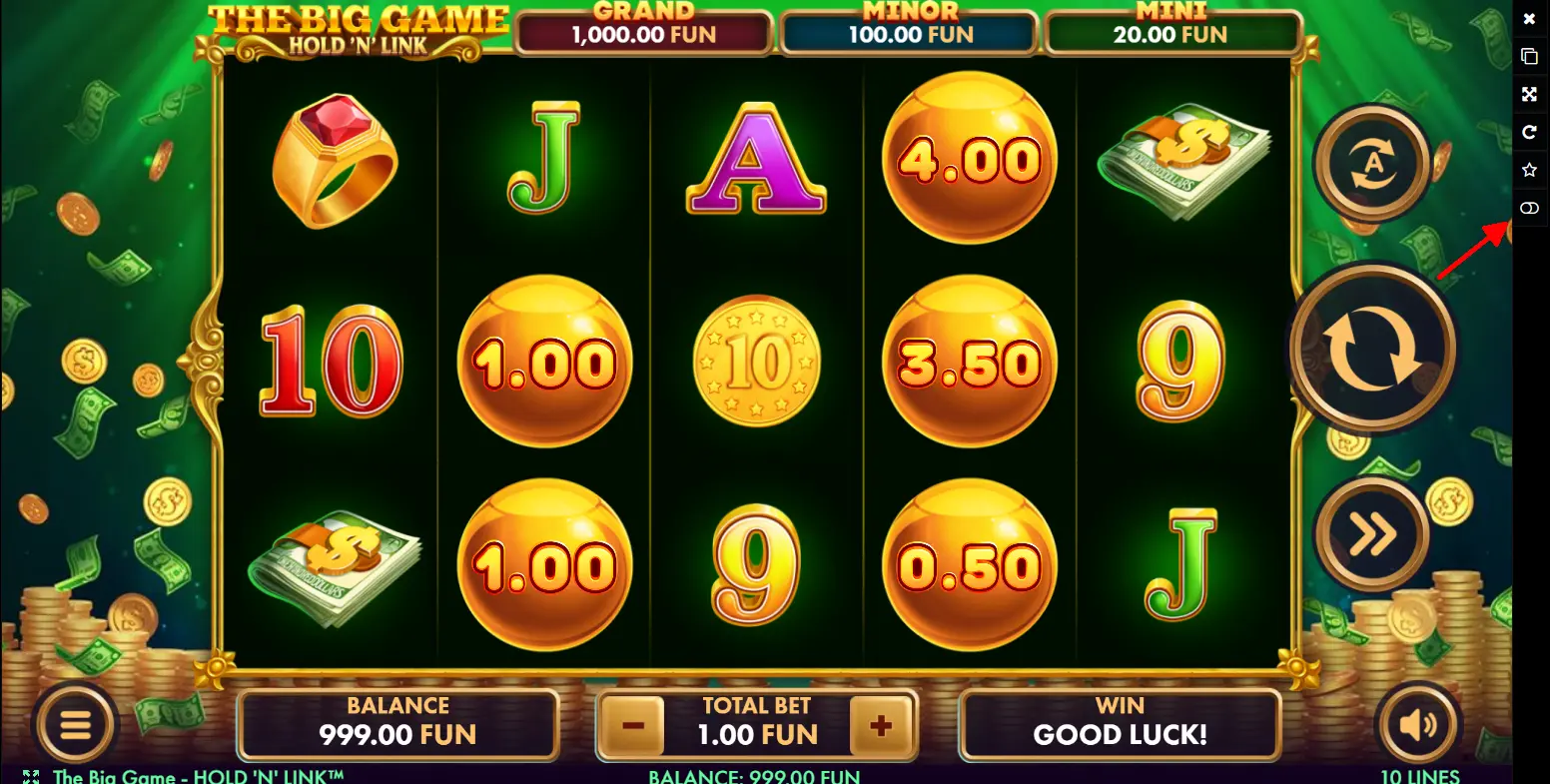 The Big Game: Hold 'N' Link, 10 tənzimlənə bilən ödəniş xətti ilə 5 bərkə və 3 sətirli video slot şəklində qurulub. Oyunun əsas cəlb edən xüsusiyyətləri arasında Hold 'n' Link Bonus funksiyası və çoxsaylı jackpot seçimləri yer alır. Oyun necə işləyir, onu aşağıda izah edirik: